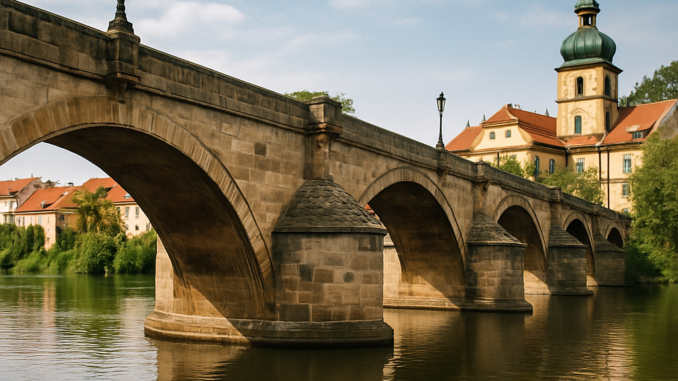 – Krok přes starý kamenný most za svítání. Najdeš tam vrstvy jako v knize: původní kameny vedle pozdějších záplat. Stojíš přímo v příběhu. Často je to venkovský most s malou kapličkou nebo litinovým kovaným zábradlím.